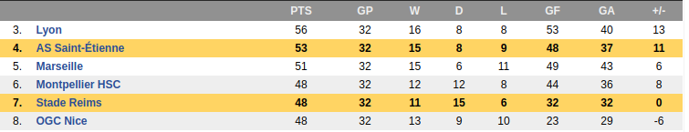 - St. Etienne is fourth placed in the table thanks to the fifteen wins, eight draws and nine defeats earned from the thirty-two games played so far. in all completions they are with two wins, two loses and pone draw in their last five on the road games.