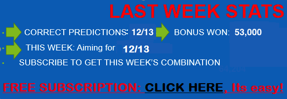 CONGRATS TO EVERYONE WHO USED OUR TIPS LAST MIDWEEK. AS 5 LUCKY KENYANS GOT 13/13, WE MANAGED TO GET 12/13 AND WON 53K IN THE PROCESS. OUR TARGET THIS WEEK IS 12/13 AND ARE SURE OF AT LEAST 10 GAMES. CLICK HERE TO SUBSCRIBE FOR FREE