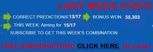 CONGRATULATIONS: WE WON A BONUS OF 55K FOR 13/17 CORRECT MEGA JACKPOT PREDICTIONS LAST WEEK WIN A BONUS FOR 15/17. WE ARE SURE OF 13 GAMES AND WILL USE DOUBLE CHANCES IN THE OTHER 2 AND JUST RISK THE FINAL 2. CLICK HERE TO REGISTER