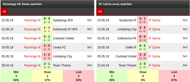 Rynninge IK Vs IF Sylvia Prediction: Current form