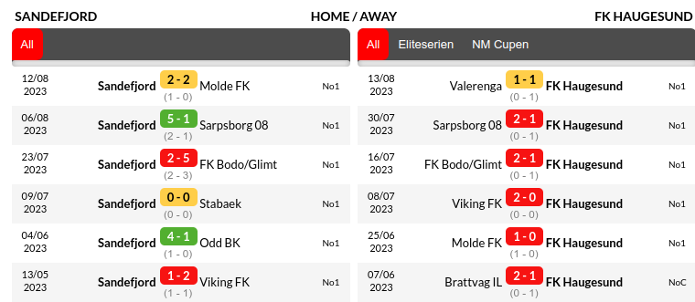 The previous encounter between these two teams in Eliteserien action saw Haugesund emerge victorious with a 3-2 scoreline at Haugesund Sparebank Arena in June. Bilal Njie initiated the scoring for FK Haugesund in the 10th minute, and Sory Diarra also made it onto the scoresheet. For Sandefjord, Danilo Al-Saed and Franklin Nyenetue managed to find the back of the net.