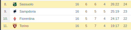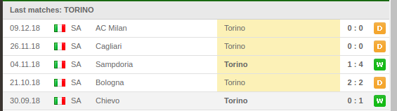 - Torino has played sixteen games so far in this campaign which have earned them five wins, seven draws, and four defeats. They have collected twenty-two points so far.