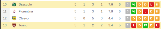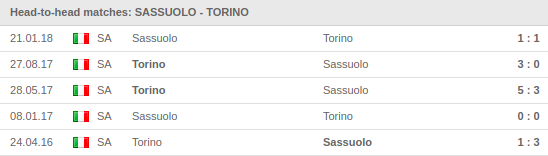 Torino won two while Sassuolo won one of their last five games against each other. The rest of the games ended with a draw.