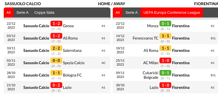 Fiorentina’s key players, Giacomo Bonaventura and González, have each scored six goals. Sassuolo relies on Berardi, their leading scorer with nine goals, ranking second in the league for the 2023/2024 season.