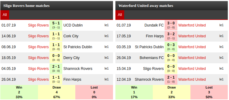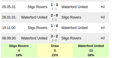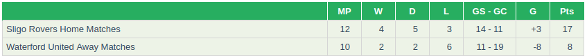 Sligo Rovers Vs Waterford Utd Prediction: Home/Away Matches