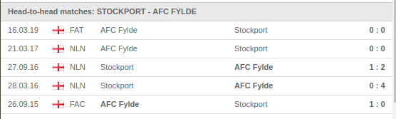 - In the last two consecutive games, the two teams have had a goalless draw with AFC Fylde hosting Stockport.