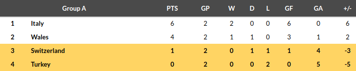 Switzerland still have a chance of making it to the round of 16 as the best third-place finishers. They performed well in their first match against Wales, but Italy was too good for them. Expect them to bounce back against a depleted Turkey.