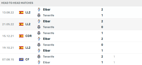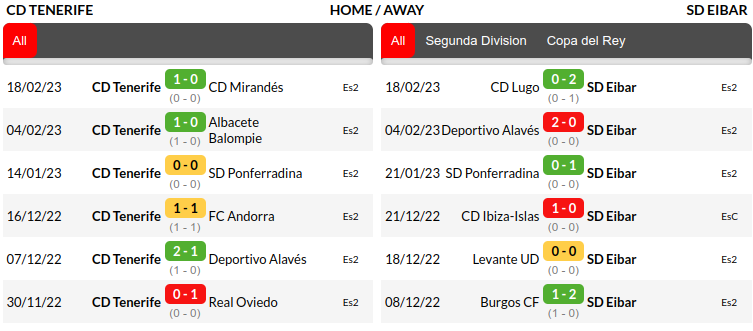 - Over the last six league games, Tenerife has won three, drawn one, and lost two, while Eibar has won three, drawn one, and lost two.
