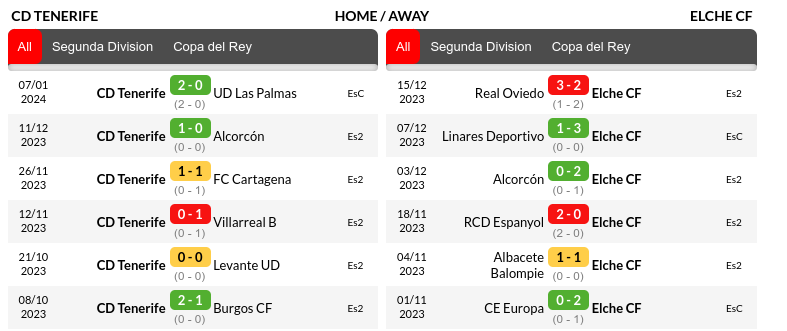 In their recent six league matches, Tenerife won two, drew two, and lost two. Conversely, Elche won two, drew one, and lost three in their last six Segunda División encounters.