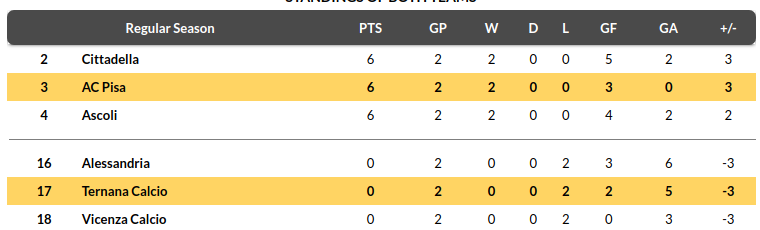 - Pisa are among the four teams with a 100% record to the league from the opening two matches.