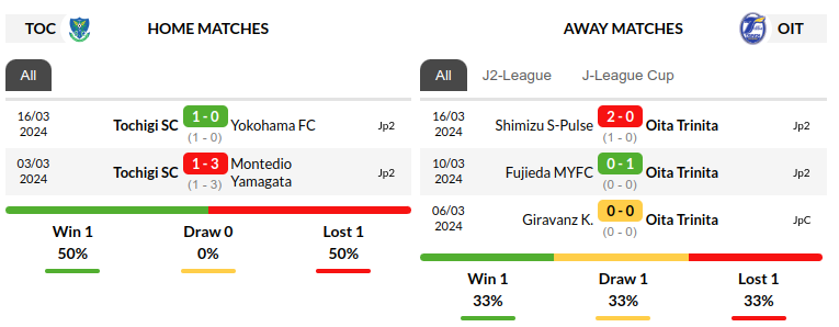 Historically, Oita Trinita has dominated this matchup. They haven’t suffered a defeat against Tochigi S.C. in their last seven J2 League encounters. Furthermore, their overall record against Tochigi S.C. is favorable, with three wins secured in their last twelve meetings.
