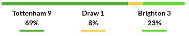 - In their last six league games, Tottenham have won three, drawn two, and lost one, while Brighton has won three, drawn two, and lost one.