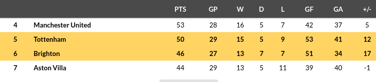 - The Seagulls is four points behind Tottenham and competing for a spot in the Europa League.