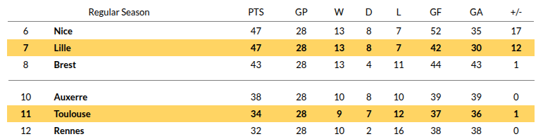 Currently seventh with 47 points, Lille are tied with Nice for the final European football berth, while mid-table Toulouse (11th, 34 points) sit 13 points adrift.