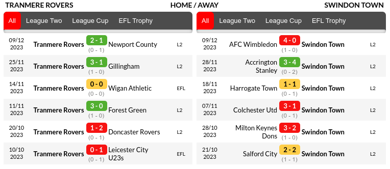 In their recent six league matches, Tranmere has won three, drawn two, and lost one. Swindon, on the other hand, has won two, drawn one, and lost three in their last six outings.