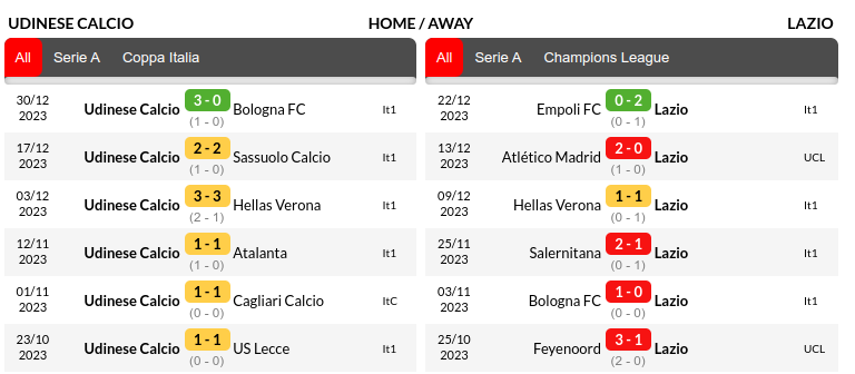 In their last six league matches, Udinese won one, drew three, and lost two. Lazio won three, drew one, and lost two.