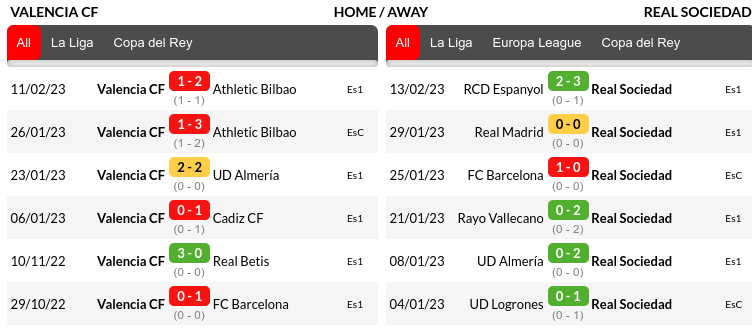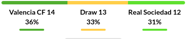- In their last six league matches, Valencia have lost five and drawn one, while Real Sociedad have won three, drawn two, and lost one.