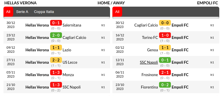 In their recent six league matches, Verona won one, drew two, and lost three. Empoli has drawn three and lost three.