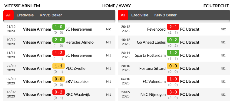 In their last six league matches, Vitesse won one and lost five, while Utrecht won two and drew four.