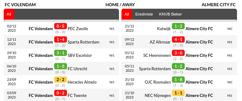 In their recent six league matches, Volendam won one, drew one, and lost four. Almere, in their last six, won two, drew one, and lost three Eredivisie encounters.