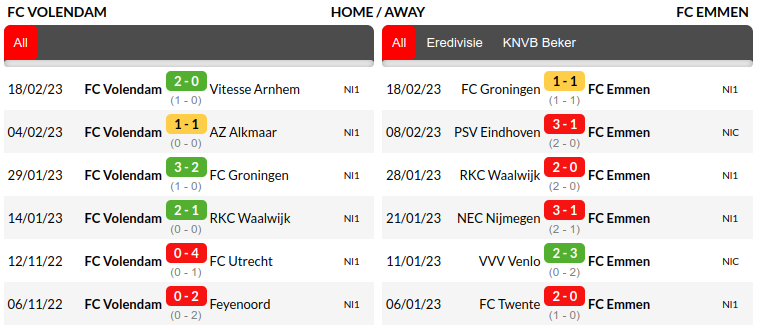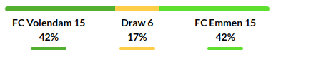 - Over their last six league games, Volendam has won two, drawn two, and lost two, while Emmen has won one, drawn three, and lost two.