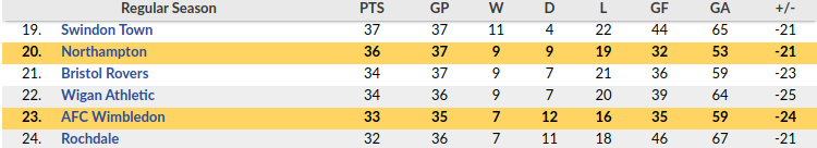 - Failing to to turn wins into draws sees the hosts 2nd from bottom three points behind Northampton who sit at the edge of the bottom four.