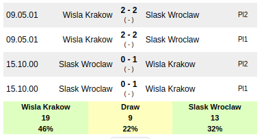 Wisla Krakow vs Slask Wroclaw: Head to head
