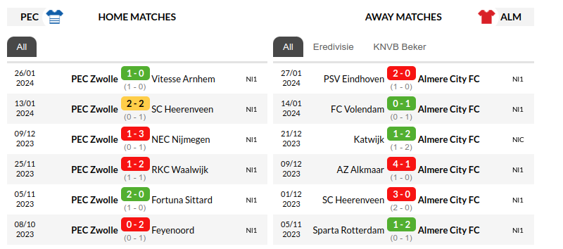 In their recent six league matches, PEC Zwolle has won two and drawn four, while Almere has won three, drawn two, and lost one.
