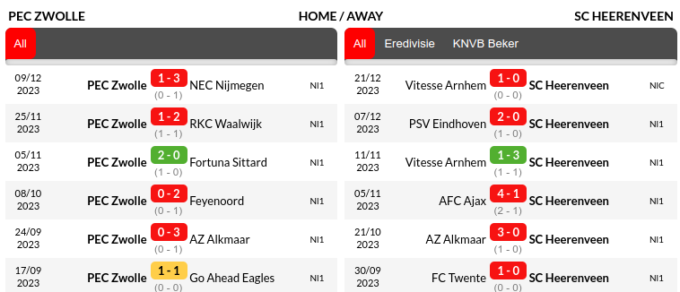 In their recent six league matches, Zwolle won two, drew one, and lost three, while Heerenveen won three and lost three in their last six Eredivisie encounters.